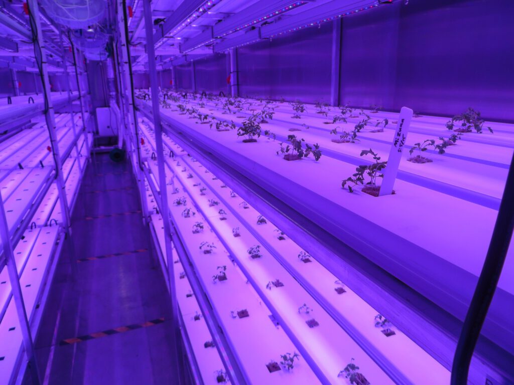 Past the control room and through the nursery, Jeff Hicks stands in the growing room of the standard 40-foot connex. While spinning exhaust fans and glowing purple lights regulate the temperature of the container, he takes inventory of its 600 seedlings.