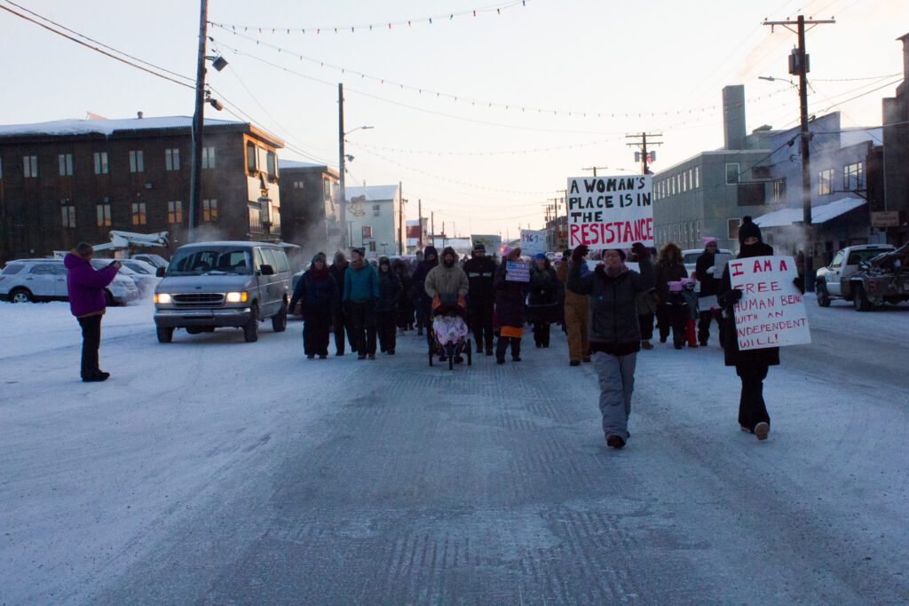 With parkas on and dogs in tow, participants in the Nome Women’s March on Saturday, January 21st, endured the -17 temperature to make a showing of solidarity for equal rights.