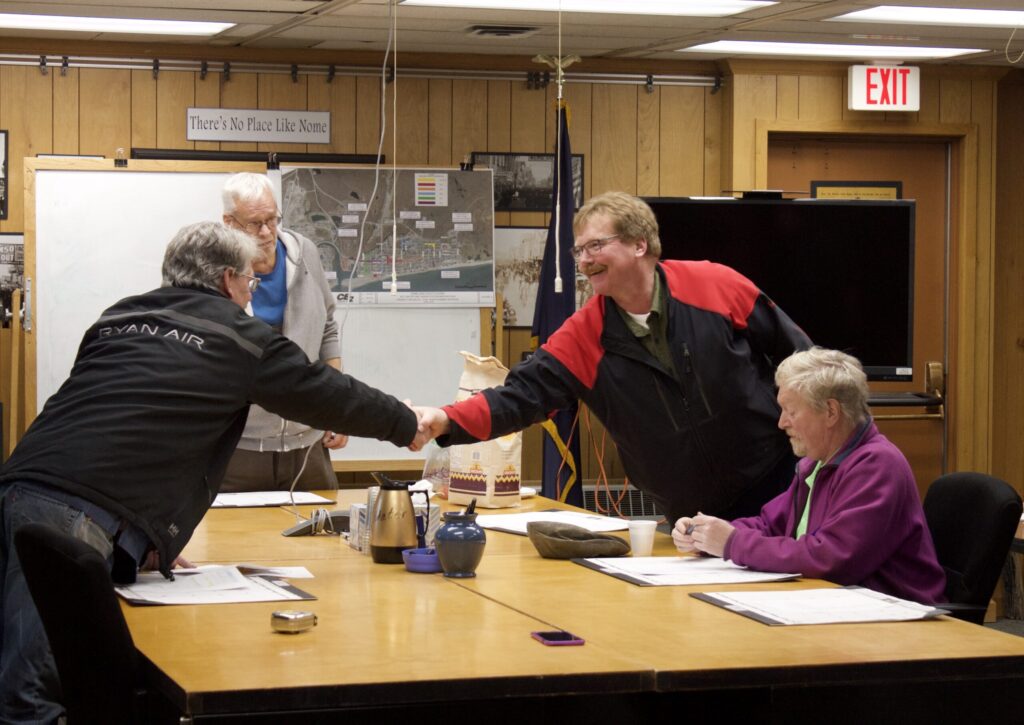 Image at top: Sparks shakes Brown’s hand during Spark’s last City Council meeting. The former Councilman completed the “handoff” with Adam Martinson, who will now hold Seat A on the Council. Photo Credit: Davis Hovey, KNOM (2017)