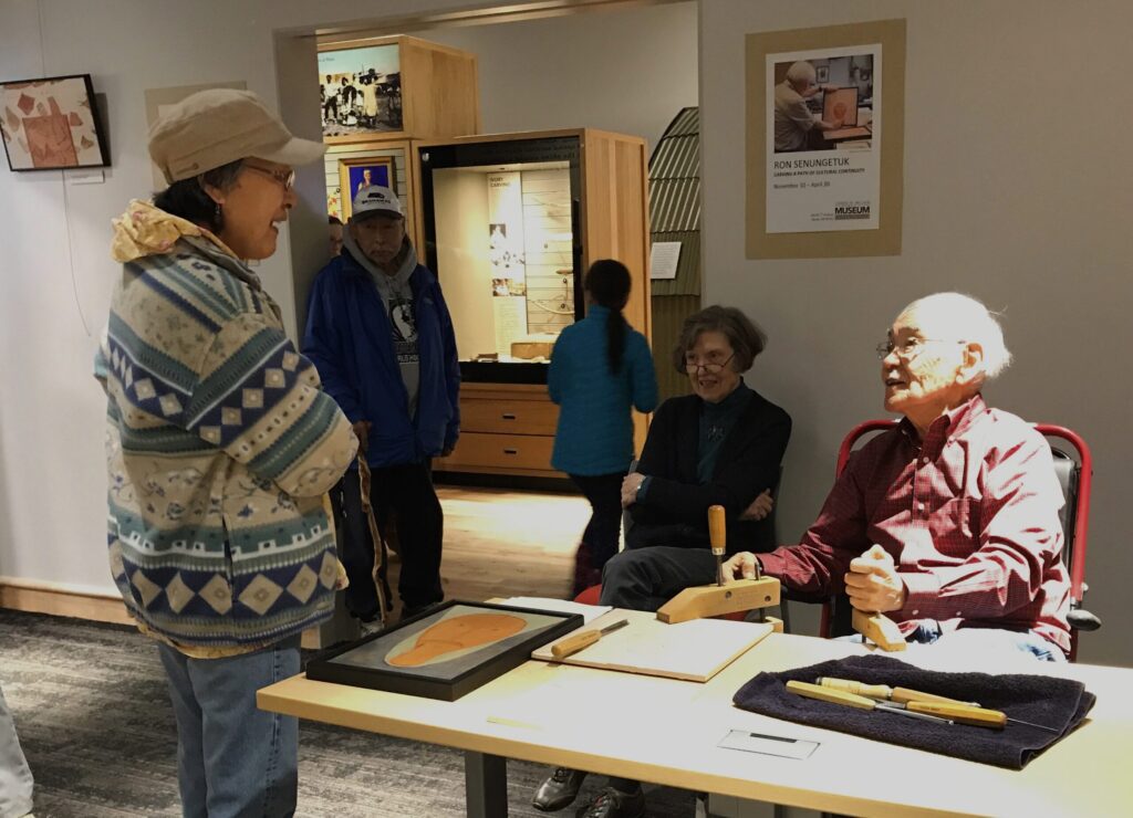 Image at top: Artist Ron Senungetuk speaks with visitors to the Carrie M. McLain Memorial Museum. His work is featured in a special exhibit “Carving a Path of Cultural Continuity.” Photo: Amy Phillips-Chan, used with permission.