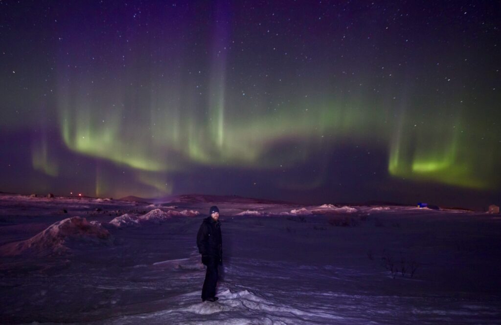 Image: Gabe in front of the Northern Lights on an April night (photo: Michael Burnett, April 2018).
