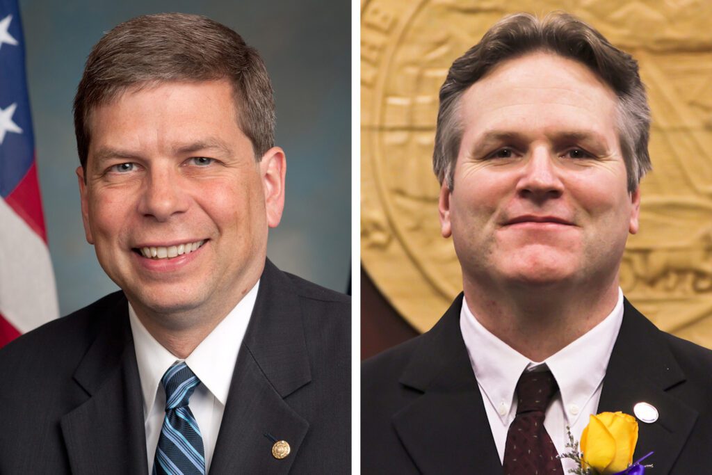 Image at top: 2018 Alaska gubernatorial candidates Mark Begich and Mike Dunleavy. (Photo credits: official portrait of US Senator Mark Begich, 2012, public domain, via Wikimedia Commons; portrait of Alaska Senator Mike Dunleavy from Alaska Senate Majority via Flickr and Wikimedia Commons (CC BY-SA 2.0).) Image composite: David Dodman, KNOM.