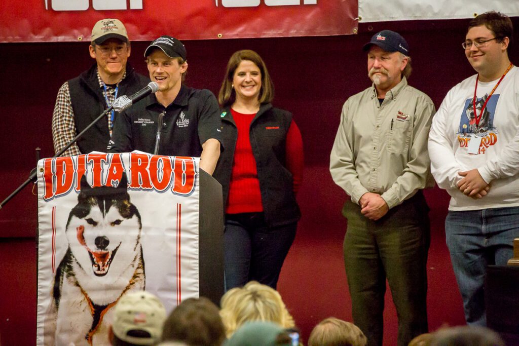 Image at top: file photo: 2014 Iditarod champion Dallas Seavey speaks at the podium at the finishers’ banquet in Nome. Photo: David Dodman, KNOM.