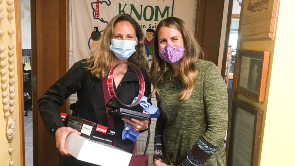 Image at top: KNOM trivia champion Danielle Sylvester stands with KNOM board member Amy Gorn. She was one of five community members to win a free radio and antenna booster.