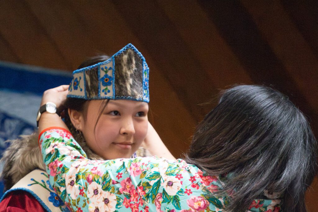 Gray took the stage in a purple floral kuspuk originally crafted for her Great Grandmother Carol Piscoya along with a beaded beret gifted to her by her mother, Kimberly Piscoya-Gray.