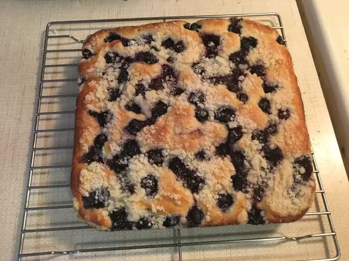 - Arrange blueberries over batter, sprinkle with crumb topping.