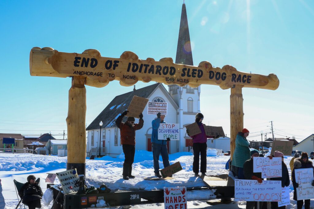 Protestors gathered in Nome’s Anvil City Square Saturday to take part in the nationwide “Hands Off!” protest. The group of over 40 people held homemade signs and led chants on the snowy ground surrounding the Iditarod’s Burled Arch.