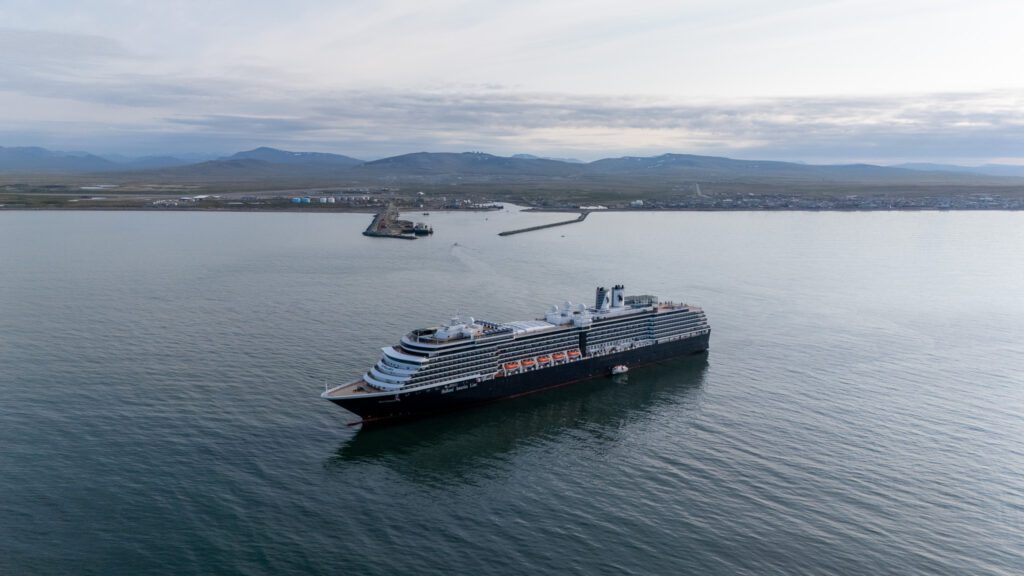 After a quick stop in Dutch Harbor, the Westerdam floated up to Nome through calm waters but overcast skies. Wearing a bright blue t-shirt, Connor Lommerse from Florida said Nome’s balmy 60 degree temps and blue skies were a welcome change.