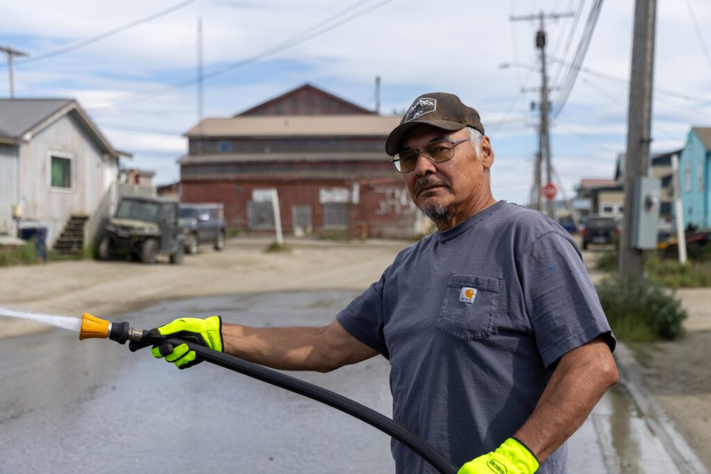 Several times a day, Nome resident Aaron Jackson can be spotted out front of his home on Steadman Street watering the road.